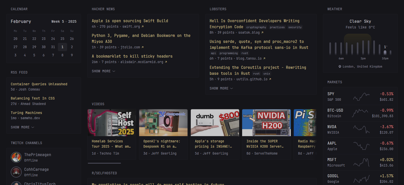 ```yaml define: - &subreddit-settings type: reddit collapse-after: 5 pages: - name: Home width: wide columns: - size: full widgets: - type: split-column max-columns: 5 widgets: - subreddit: selfhosted <<: *subreddit-settings - subreddit: homelab <<: *subreddit-settings - subreddit: linux <<: *subreddit-settings - subreddit: sysadmin <<: *subreddit-settings - subreddit: DevOps <<: *subreddit-settings - subreddit: Networking <<: *subreddit-settings - subreddit: DataHoarding <<: *subreddit-settings - subreddit: OpenSource <<: *subreddit-settings - subreddit: Privacy <<: *subreddit-settings - subreddit: FreeSoftware <<: *subreddit-settings ```