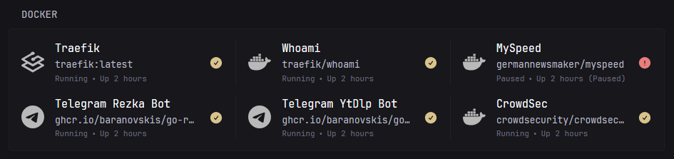 ``` Note the use of `|` after `source:`, this allows you to insert a multi-line string. ### Docker Containers The Docker widget allows you to monitor your Docker containers. To enable this feature, ensure that your setup provides access to the **docker.sock** file (also you may use a TCP connection). Add the following to your `docker-compose` or `docker run` command to enable the Docker widget: **Docker Example:** ```bash docker run -d -p 8080:8080 \ -v ./glance.yml:/app/glance.yml \ -v /etc/timezone:/etc/timezone:ro \ -v /etc/localtime:/etc/localtime:ro \ -v /var/run/docker.sock:/var/run/docker.sock:ro \ glanceapp/glance ``` **Docker Compose Example:** ```yaml services: glance: image: glanceapp/glance volumes: - ./glance.yml:/app/glance.yml - /etc/timezone:/etc/timezone:ro - /etc/localtime:/etc/localtime:ro - /var/run/docker.sock:/var/run/docker.sock:ro ports: - 8080:8080 restart: unless-stopped ``` #### Configuration To integrate the Docker widget into your dashboard, include the following snippet in your `glance.yml` file: ```yaml - type: docker host-url: tcp://localhost:2375 cache: 1m ``` #### Properties | Name | Type | Required | Default | | ---- | ---- | -------- | ------- | | host-url | string | no | `unix:///var/run/docker.sock` | #### Leveraging Container Labels You can use container labels to control visibility, URLs, icons, and titles within the Docker widget. Add the following labels to your container configuration for enhanced customization: ```yaml labels: - "glance.enable=true" # Enable or disable visibility of the container (default: true) - "glance.title=Glance" # Optional friendly name (defaults to container name) - "glance.url=https://app.example.com" # Optional URL associated with the container - "glance.iconUrl=si:docker" # Optional URL to an image which will be used as the icon for the site ``` **Default Values:** | Name | Default | |----------------|------------| | glance.enable | true | | glance.title | Container name | | glance.url | (none) | | glance.iconUrl | si:docker | Preview: