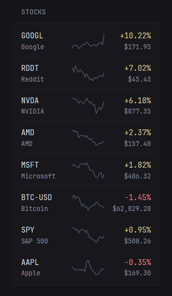 By default the markets are displayed in the order they were defined. You can customize their ordering by setting the sort-by property to absolute-change for descending order based on the stock's absolute price change.